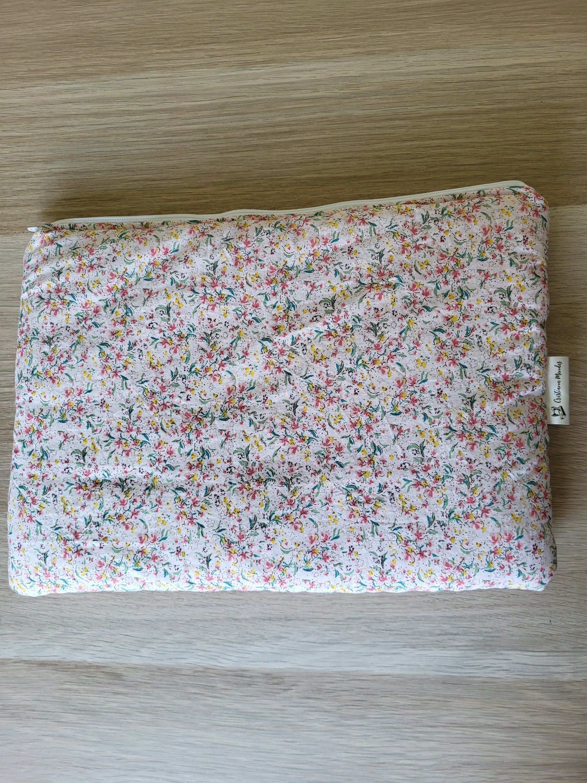 Cette grande pochette confectionnée avec soin se distingue par ses jolis tissus fleuris et son allure délicatement vintage. Douce et matelassée, elle protège vos effets personnels tout en apportant une touche de charme à votre quotidien. Son format généreux est idéal pour ranger un livre, une tablette, des documents ou vos essentiels de voyage. Pratique et raffinée, elle s’adapte à toutes vos envies : housse de rangement, pochette de voyage ou compagnon élégant de tous les jours.